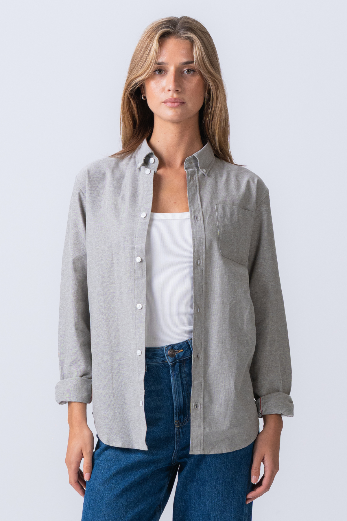 Opplev den ultimate blandingen av avslappet komfort og tidløs eleganse med vår Boyfriend Oxford Skjorte i en klassisk grå farge. Hos TeeShoppen har vi designet dette plagget for den moderne kvinnen som verdsetter stil som varer, uten å gå på kompromiss med velvære. Denne skjorten er ikke bare et klesplagg; det er en følelse av uanstrengt selvtillit, perfekt for enhver anledning.